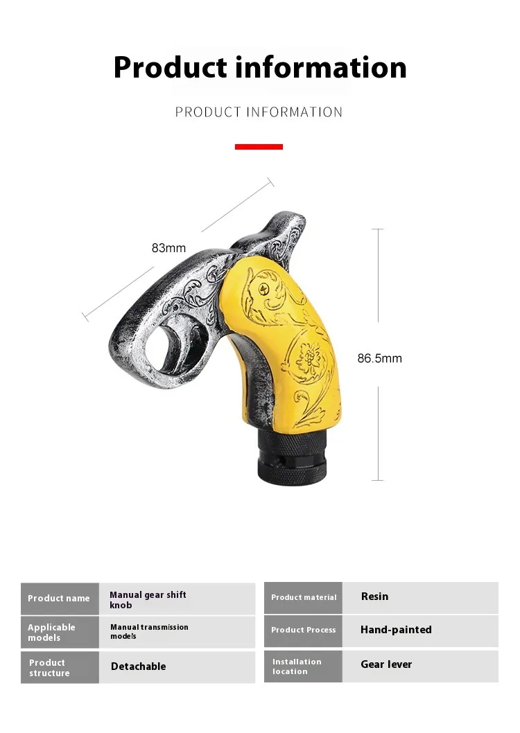 Made from high-quality resin material, this gear knob delivers a smooth and comfortable grip for effortless shifting. Available in silver and yellow, it adds a vibrant and modern flair to your vehicle’s interior while maintaining excellent resistance to wear and temperature changes.