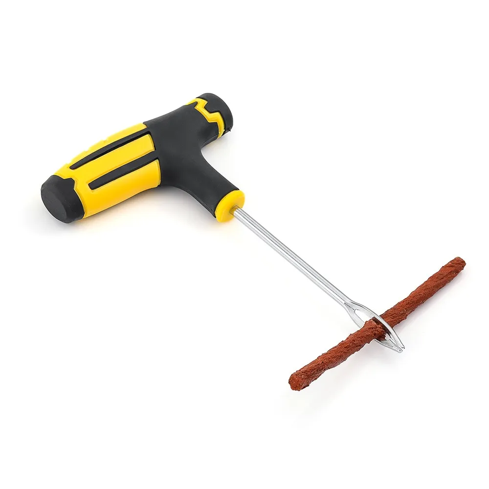 The durable plastic handles give you a comfortable, non-slip grip, while the included scraper tool cleans and widens puncture holes for better sealing. The needle tool allows easy insertion of the repair rubber strips, ensuring a secure and long-lasting fix. Complete with a bottle of tire glue and 5 high-quality repair strips, this kit is compact yet fully equipped.