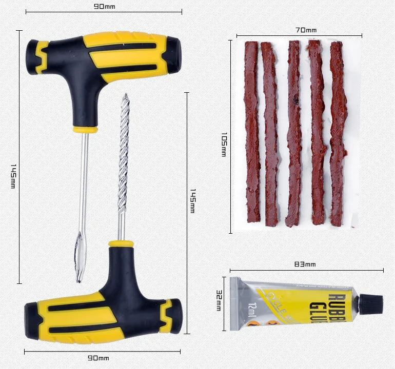Products: 1 bottle of tire glue, 5 tire tire strips, 1 plug bit, 1 thread drill bit