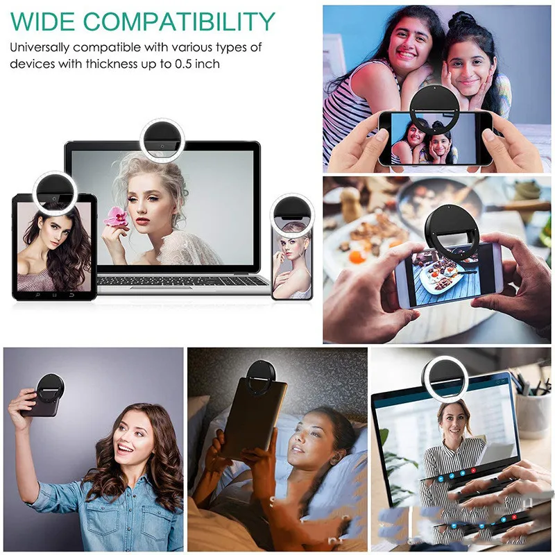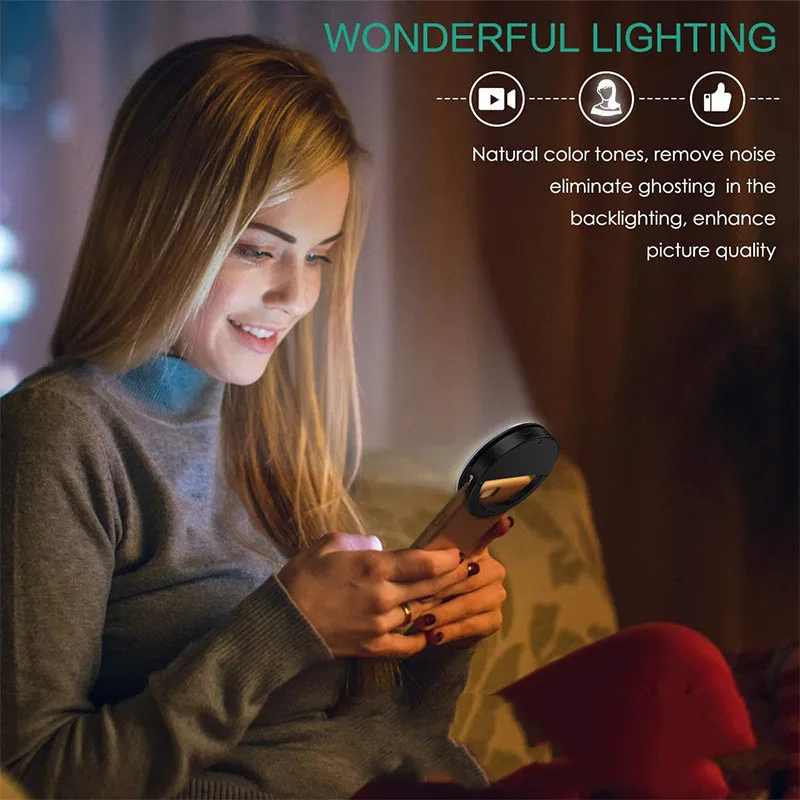 Compatible with smartphones, tablets, and laptops, the ring light easily attaches to your device and evenly distributes soft, natural light to eliminate shadows and boost your look. The compact size (86×86×27mm) and USB charging make it perfect for on-the-go content creators, beauty influencers, or anyone needing professional lighting on demand.
