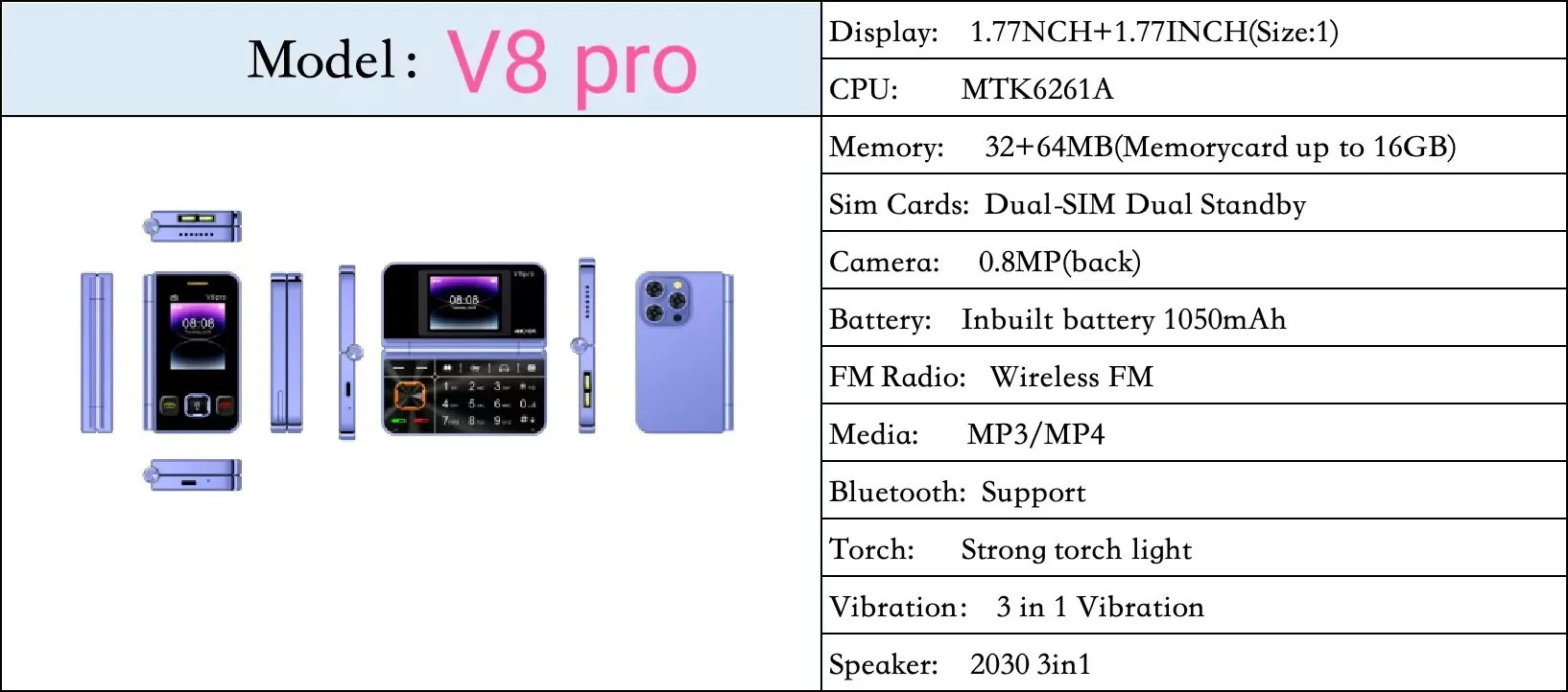 Stay connected in style with the V8pro Dual Screen Flip Phone, a classic folding mobile designed for users who prefer simplicity, reliability, and a compact design. This phone features a 1.8-inch display and a dual screen layout, providing quick visibility even when the phone is closed—ideal for quick call checks and notifications.