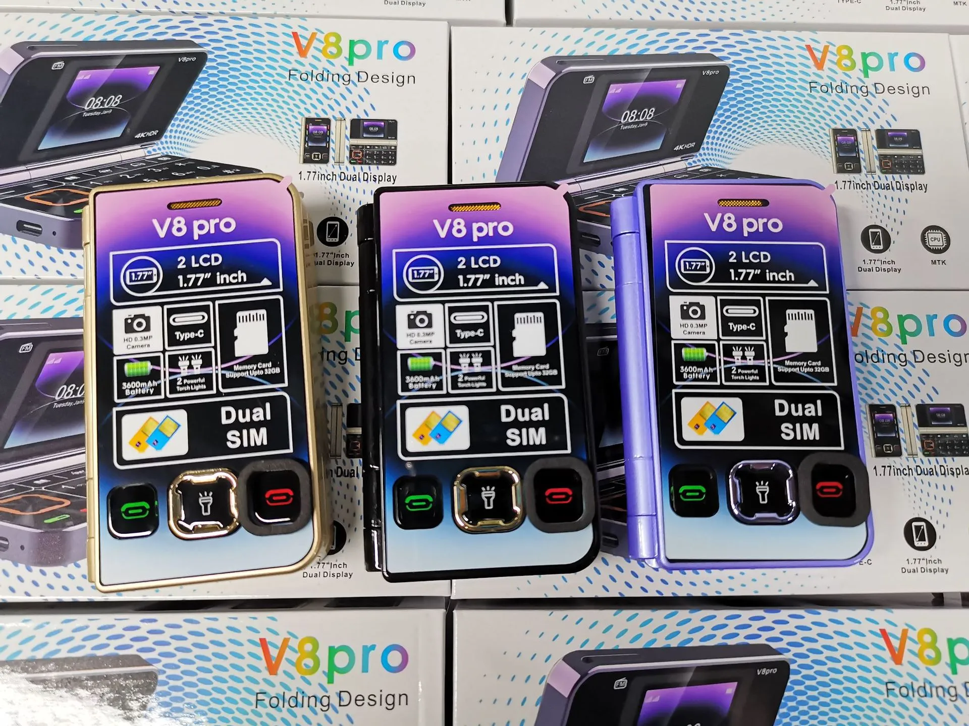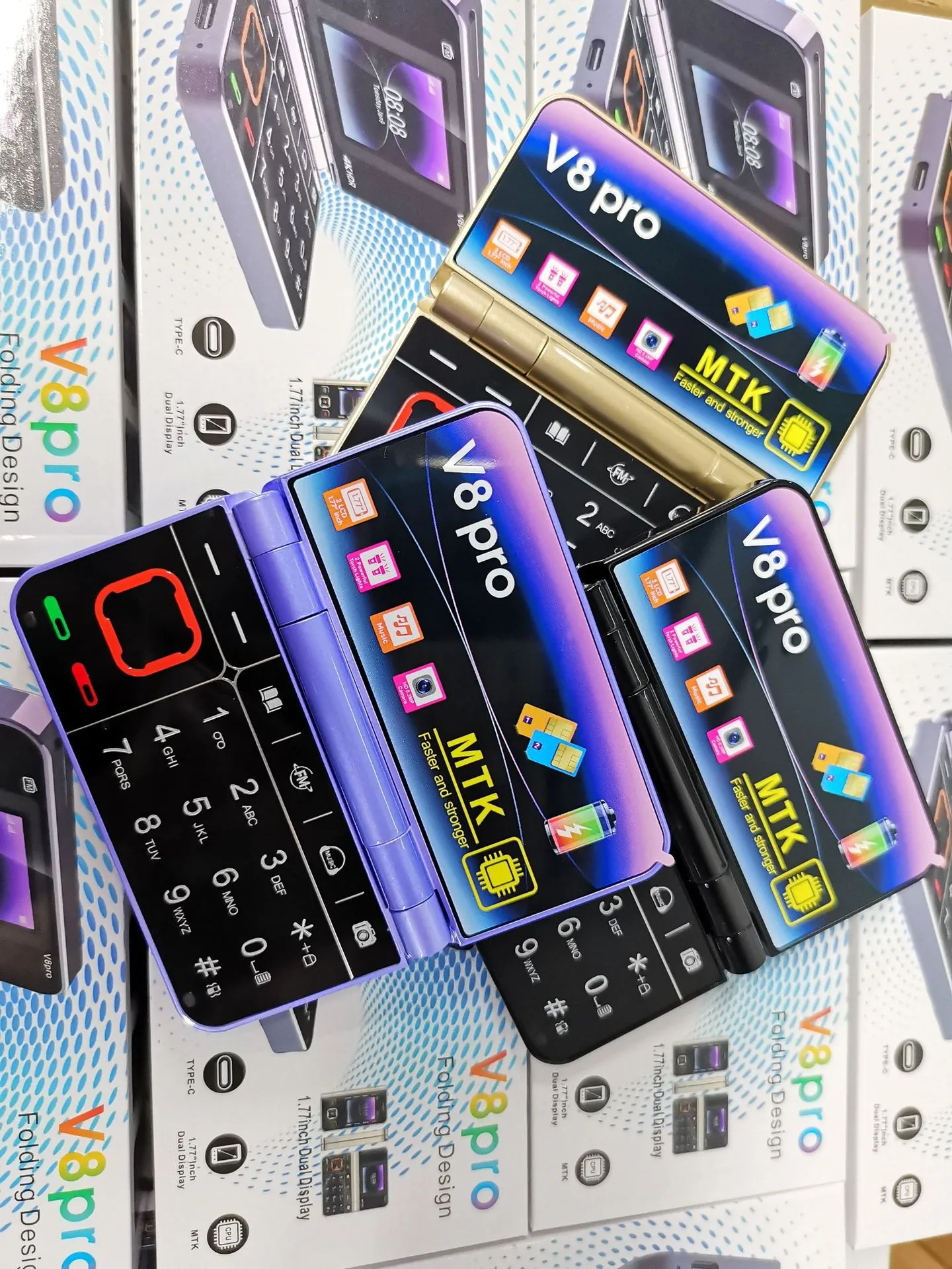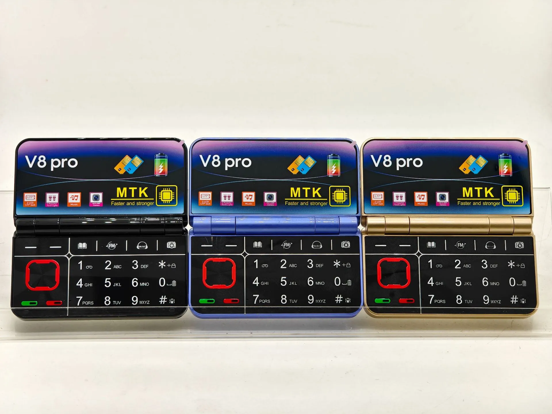Available in elegant black, gold, and purple, the V8pro is as stylish as it is functional. Easy to carry and simple to use, this flip phone is a dependable option for those who want a no-fuss mobile experience with a touch of classic charm.