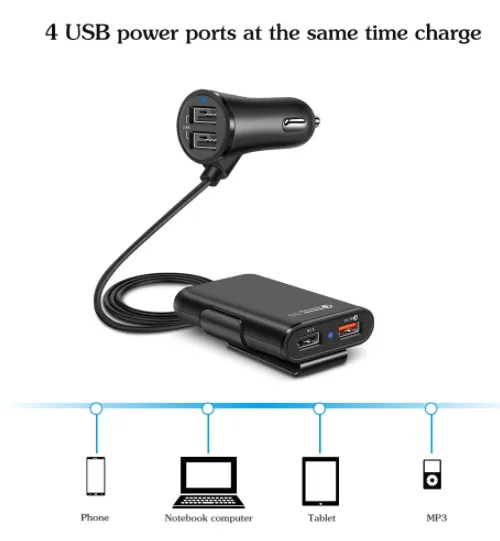 With 36W output, this charger powers smartphones, tablets, cameras, and GPS units with ease. Two USB ports provide 5V/2.4A, while the QC3.0-enabled ports support up to 12V/1.8A—ideal for fast charging compatible devices. The 5.6ft (1.7m) extension cable allows easy reach for back seat passengers.