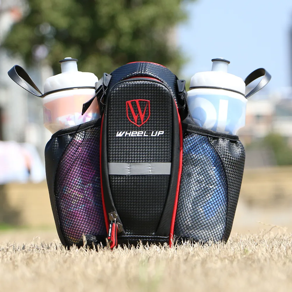 Crafted from carbon-textured, three-dimensional materials, this high-capacity saddle bag includes a double water bottle holder, giving you extra hydration options for long rides. It also features a reflective safety strip for better visibility at night and a splash-proof exterior, keeping your gear dry during unexpected rain.